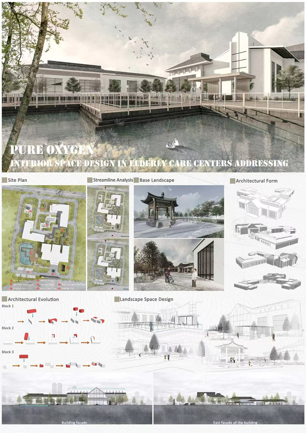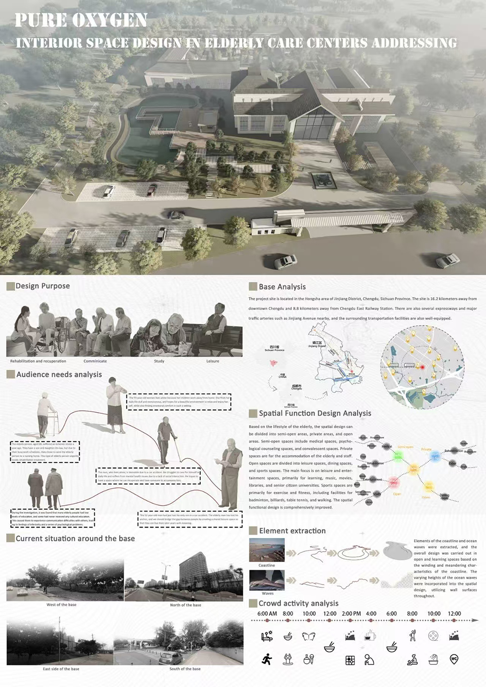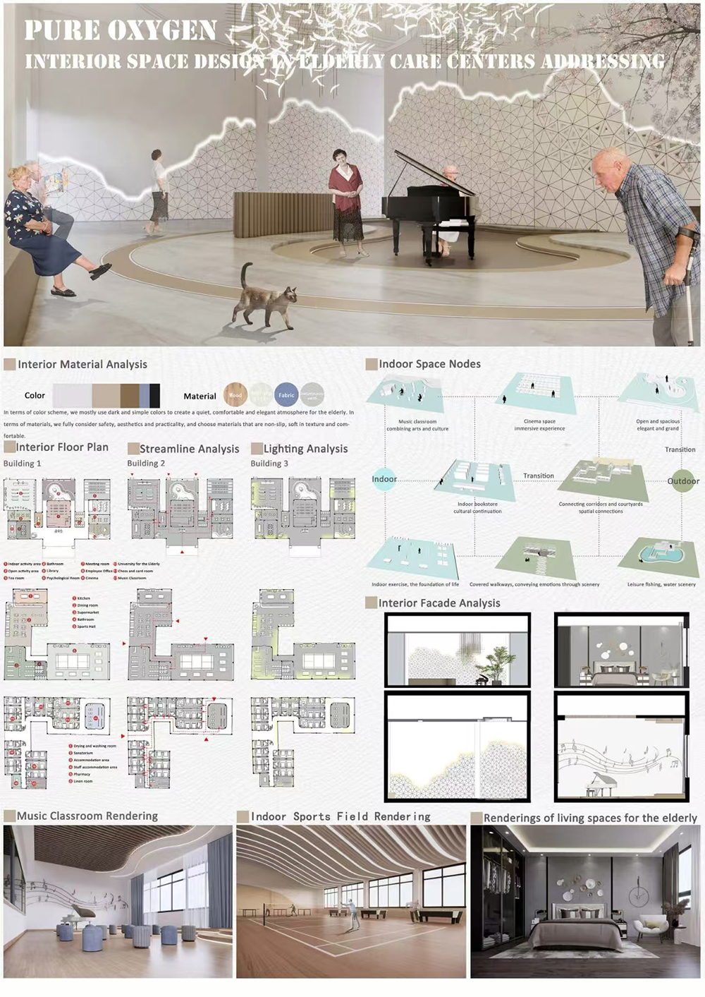 Artist / 作者 Liu Nannan 刘楠楠 Title / 作品名 Pure oxygen-Interior Space Design in Elderly Care Centers Addressing 《净氧-空巢老人养护中心室内空间设计》 Materials / Medium / 材料 KT board Dimensions / Size / 尺寸 84.1 × 59.4 cm Artwork Description / 作品简介 Taking the psychological characteristics and behaviors of elderly people living alone as its starting point, the design innovatively creates novel interior space functions, integrating diverse functions such as entertainment, learning, and art display, thus creating a diverse and multi-layered interactive space for them. 作品从空巢老人的心理特征和行为活动为出发点,创新出新颖的室内空间功能,并融入娱乐、学习、艺术展示等多元化的功能,为空巢老人营造一个多样化、多层次的互动交流空间。