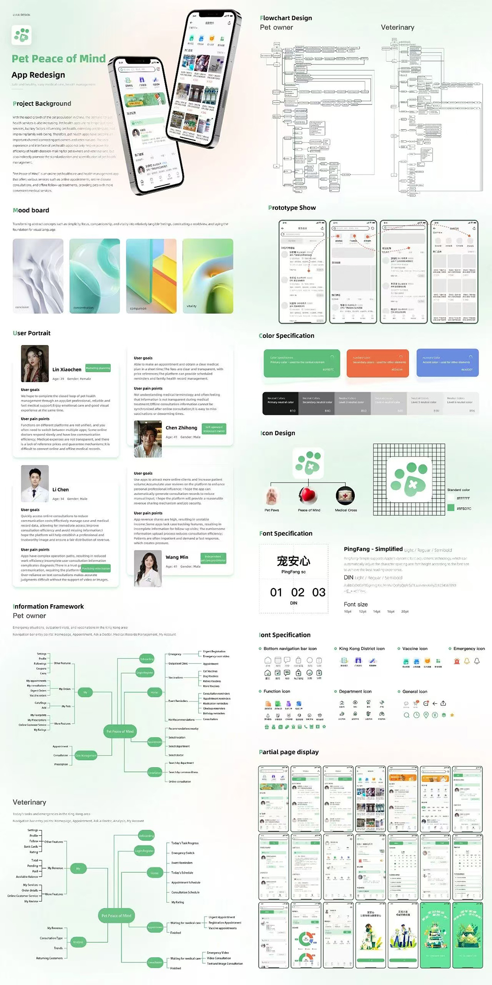 Artist / 作者 Ma Yuexi 马悦曦 Title / 作品名 User Experience and Interactive Interface Development for Mobile Applications in Pet Healthcare 《宠物医疗保健移动应用程序的用户体验和交互式界面开发》 Materials / Medium / 材料 Figma、Figjma、Photoshop、Illustrator、After Effects Dimensions / Size / 尺寸 90× 180 cm Artwork Description / 作品简介 "Pet Peace of Mind" is an online pet healthcare and health management app that offers various services such as online appointments, online disease consultations, and offline follow-up treatments, providing pets with more convenient medical services. “宠物安心”是一款在线宠物医疗保健和健康管理应用程序,提供在线预约、在线疾病咨询和线下后续治疗等各种服务,为宠物提供更便捷的医疗服务。