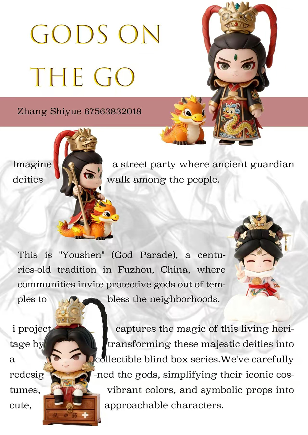 Artist / 作者 Zhang Shiyue 张诗悦 Title / 作品名 Gods on the Go 《众神巡游》 Materials / Medium / 材料 Two KT display board Dimensions / Size / 尺寸 100 × 180 cm Artwork Description / 作品简介 Weaving the tapestry of Fuzhou's God Parade into trendy blind boxes, this work seamlessly blends sacred tradition with modern life, reinvigorating a dynamic folk art form. 将福州游神融入于潮玩盲盒,将传统信仰带入日常,以现代设计重塑民间艺术的活力。
