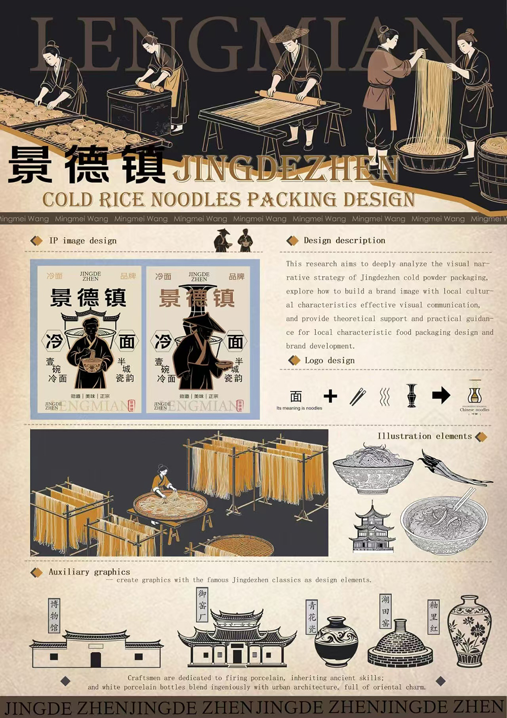 Artist / 作者 Wang Mingmei 王明媚 Title / 作品名 Jingdezhen cold rice noodles packaging design 《景德镇冷面包装设计》 Materials / Medium / 材料 KT display board Dimensions / Size / 尺寸 42 x 59.4 cm Artwork Description / 作品简介 The work deeply analyzes the visual narrative strategy of cold powder packaging in Jingdezhen, and creates a brand image and special food packaging design with local cultural characteristics. 作品深入分析景德镇冷粉包装的视觉叙事策略,打造出具有当地文化特色的品牌形象与特色食品包装设计。
