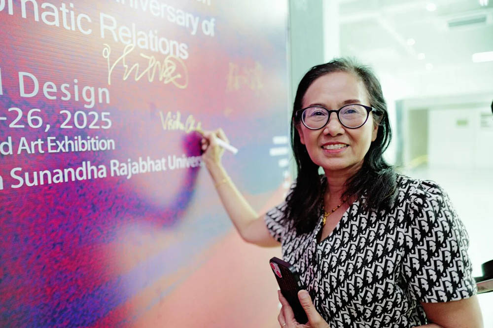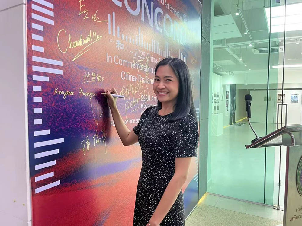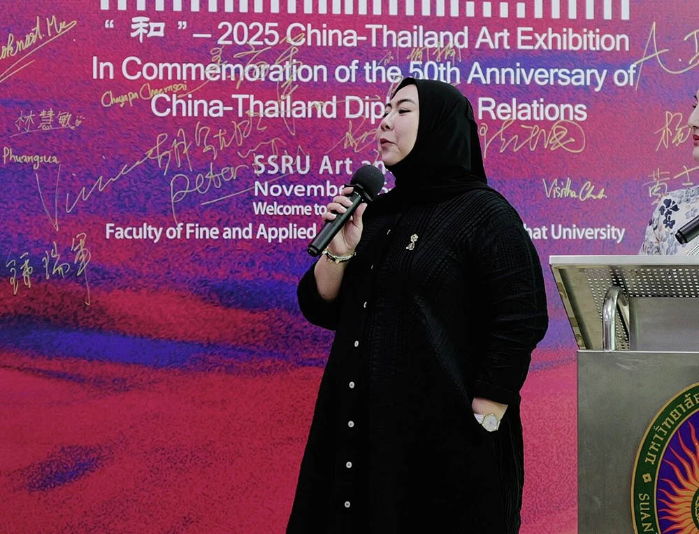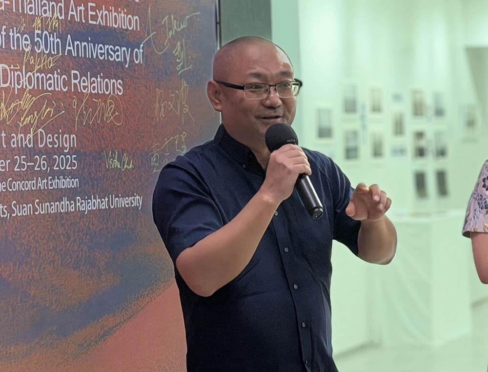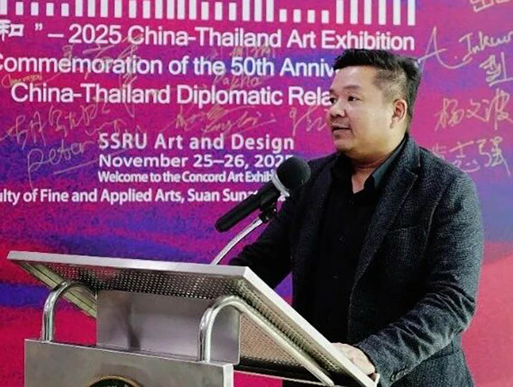 On November 25, 2025, in celebration of the 50th anniversary of the establishment of diplomatic relations between China and Thailand, the 2025 Second China–Thailand “CONCORD” International Art Exhibition officially opened at the Faculty of Fine and Applied Arts, Suan Sunandha Rajabhat University in Bangkok. The exhibition is hosted by the Faculty of Fine and Applied Arts of Suan Sunandha Rajabhat University, and jointly organized by the University’s International Alumni Association and the China–Thailand Center for Cultural and Artistic Exchange, with generous support from the Tsinghua University Alumni Association of Hainan and the Tsinghua University Alumni Association of Thailand. The exhibition brings together a wide range of artistic forms, including sculpture, lacquer painting, watercolor, design, and photography. Artists from diverse backgrounds employ their unique visual languages to present dialogue, exchange, innovation, and mutual inspiration within a contemporary context. The works embody the spiritual essence of cultural traditions while also revealing new aesthetic extensions and creative reflections through cross-cultural expression. The exhibition aims to enhance cultural exchange between China and Thailand through diverse visual languages and artistic narratives, while fostering interaction and collaboration among young artists and scholars from both countries. By commemorating this historically significant year through art, the event further promotes the integrated development of Sino–Thai cultural and artistic relations in the new era. 2025年11月25日,值中泰建交50周年之际,“2025第二届中泰‘CONCORD’国际艺术作品展”在泰国曼谷宣素那他皇家大学艺术学院隆重开幕。 本次展览由宣素那他皇家大学艺术学院主办,宣素那他皇家大学艺术学院留学生校友会与中泰文化艺术交流中心承办,并得到泰国清华大学校友会、清华大学海南校友会及黑龙江省工艺美术与非遗协会的大力支持。 展览汇集了雕塑、漆画、水彩、设计、摄影等多种艺术形式,来自不同背景的创作者以独特的艺术语言,呈现出在当代语境中的对话、交流,创新与互鉴。作品既体现出文化传统的精神性,也在跨文化表达中展现出新的审美延展与创作思考。 本届展览旨在通过多元的视觉表达与艺术叙事,加强中泰文化艺术领域的人文交流,促进两国青年艺术家与学者之间的互动与合作。活动以艺术的方式纪念这一具有历史意义的重要时刻,进一步推动中泰文化艺术在新时代背景下的融合与发展。